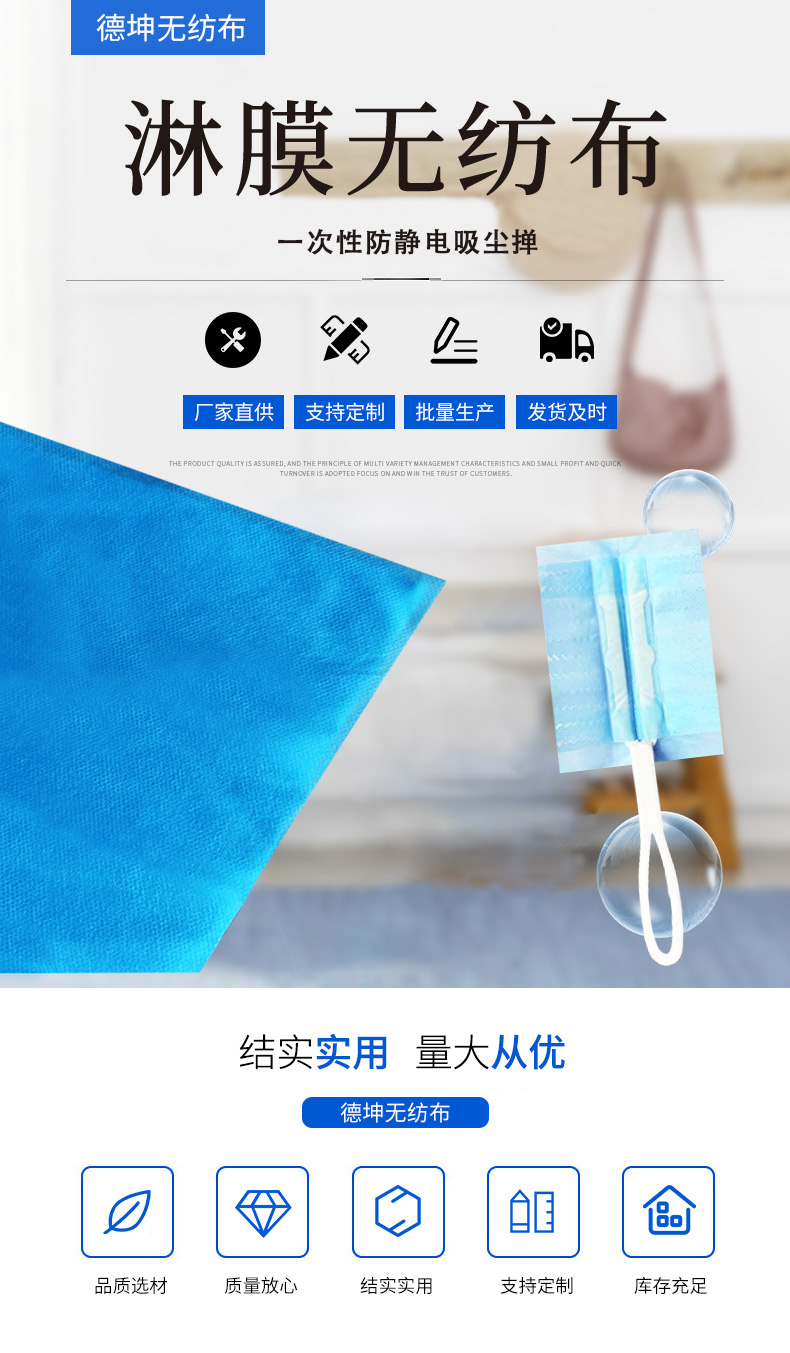 - 一次性静电吸尘掸淋膜无纺布供应pp+pe防静电柔软有弹性有什么用