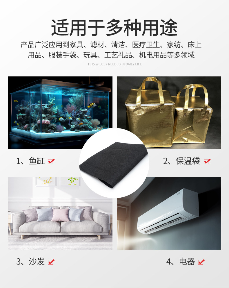 该针刺无纺布广泛应用于家居、汽车座椅、箱包、鞋材等领域。在家居行业中,它主要用于制作沙发打底布、衬布等,增加沙发的舒适性和耐久性。